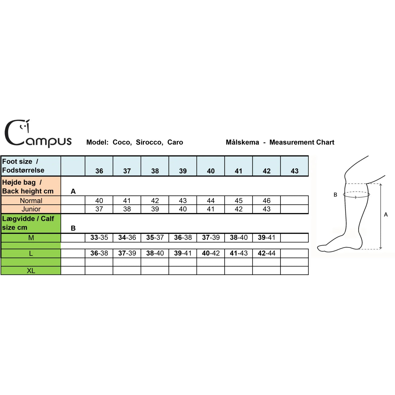 Sirocco fås i to lægvidder og to skafthøjder, så du kan finde den helt rigtige pasform (se måleskema på billedet). Er du i tvivl om størrelse, hjælper vi dig gerne.