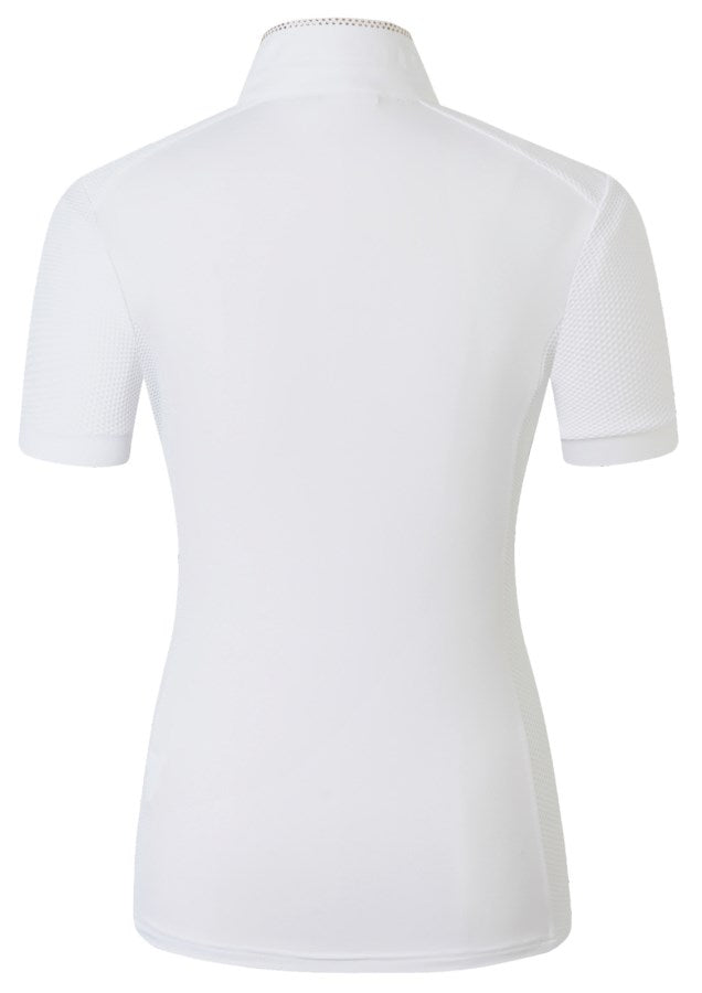 Materialet er let og åndbart med gode fugttransporterende egenskaber, som hjælper med at holde dig tør og komfortabel under ridning. En praktisk og stilren stævneskjorte, der er skabt til at fungere optimalt på stævnebanen.