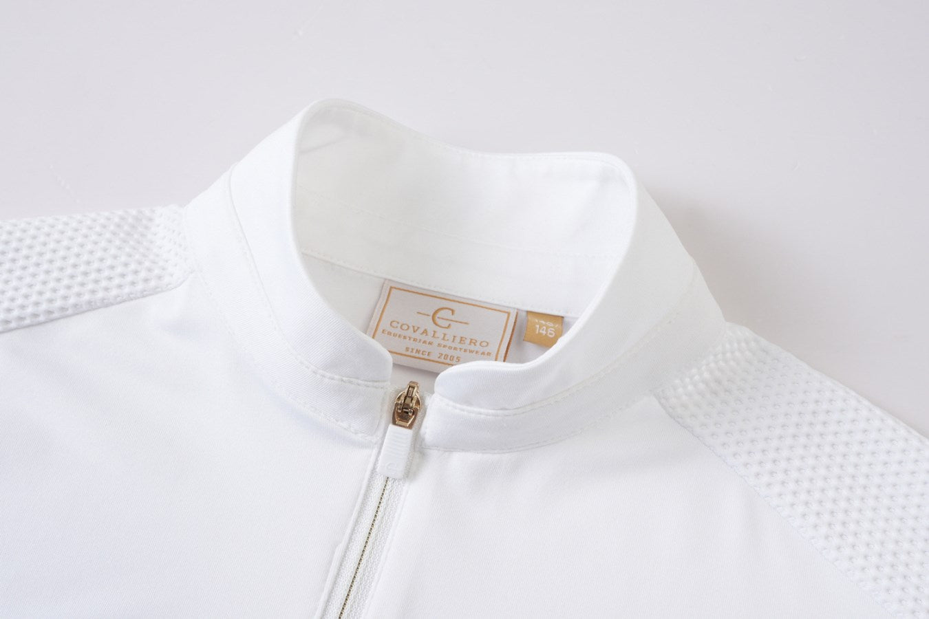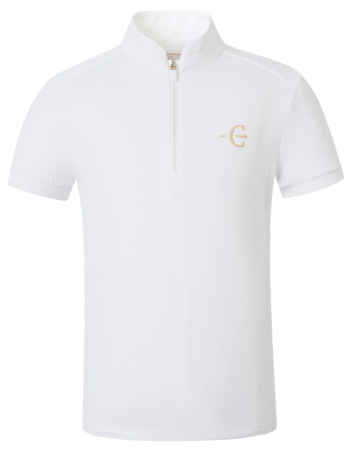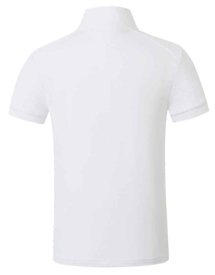 Materialet er let og åndbart med gode fugttransporterende egenskaber, som hjælper med at holde dig tør og komfortabel under ridning. En praktisk og stilren stævneskjorte, der er skabt til at fungere optimalt på stævnebanen.
