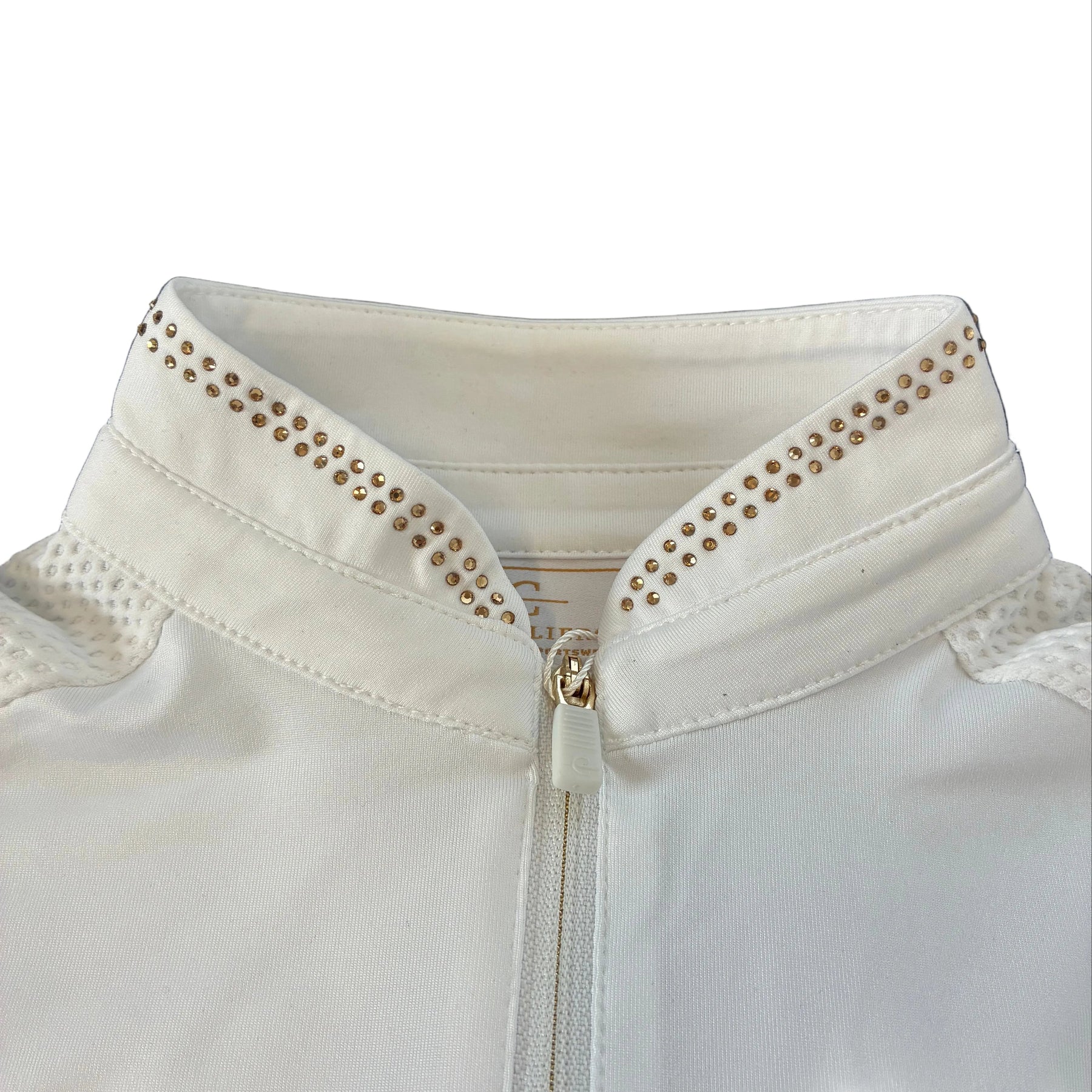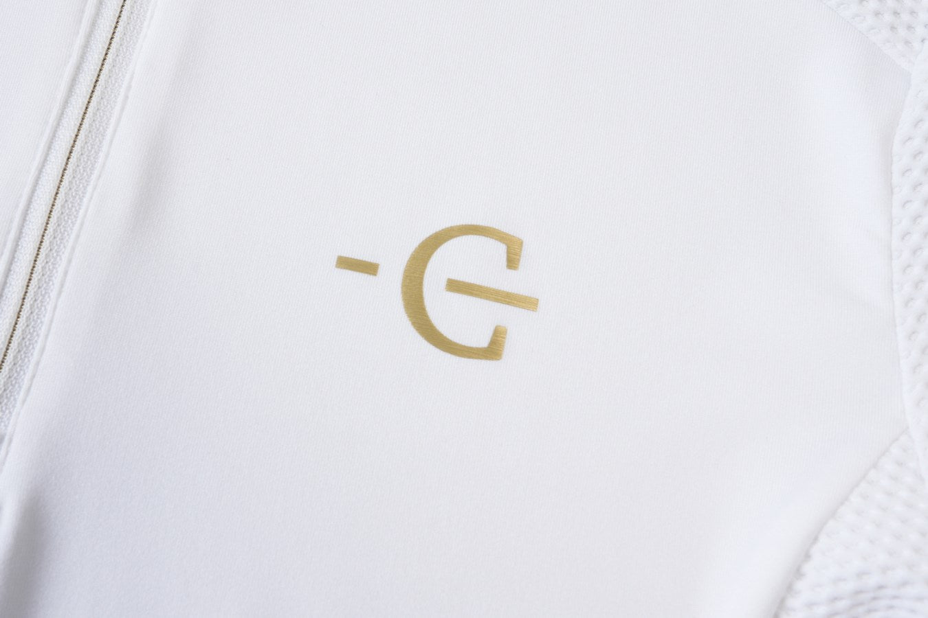 Denne stævneskjorte i hvid kombinerer et elegant udtryk med funktionel komfort. Den opretstående krave giver et klassisk og stilrent look, mens lynlåsen med “self-lock” funktion og en lille trykknap sikrer en god og justerbar pasform.