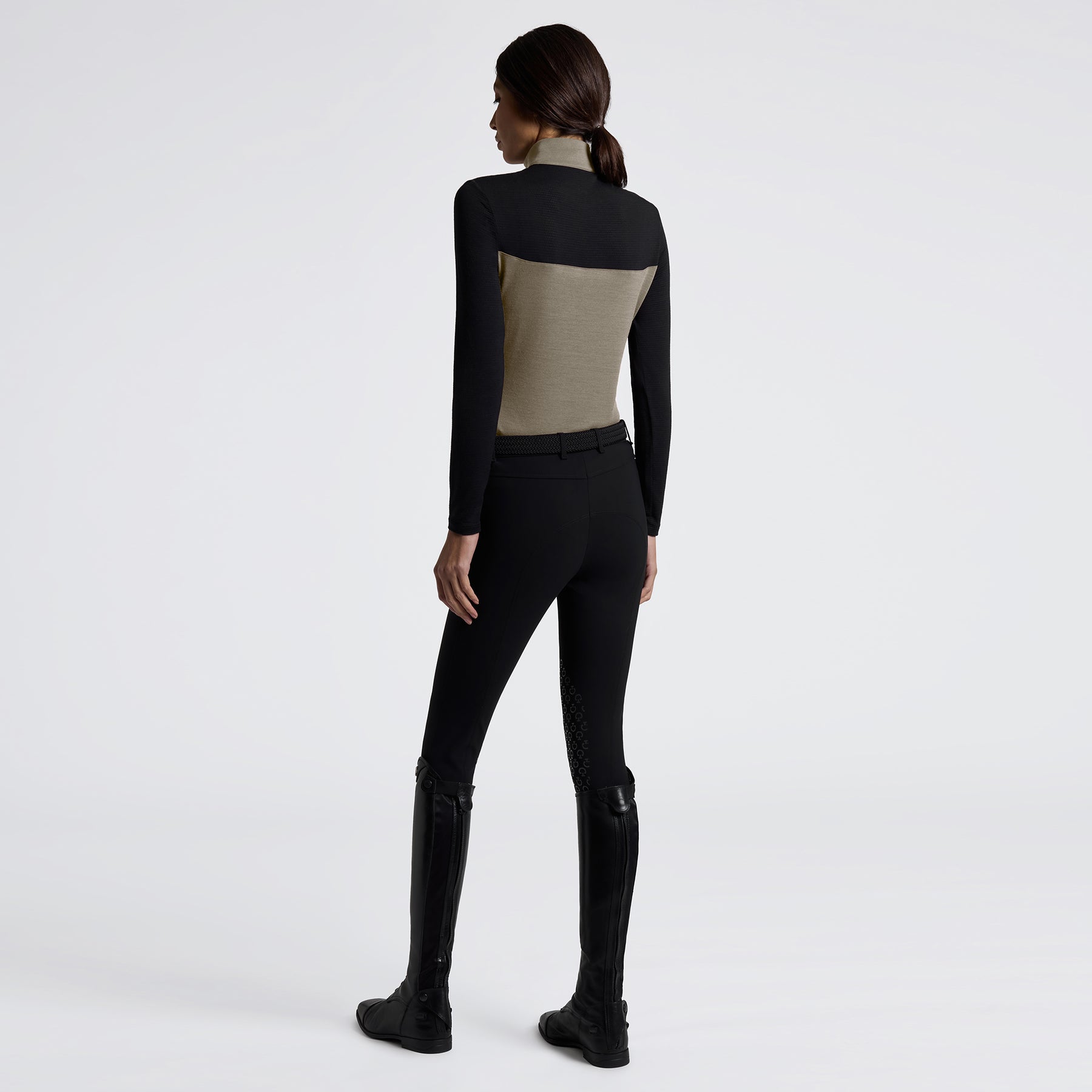 Den høje krave og den halv-lynlås med personlig CT-detalje giver et moderne og funktionelt udtryk, mens den figursyede pasform sikrer fuld bevægelsesfrihed under ridning.