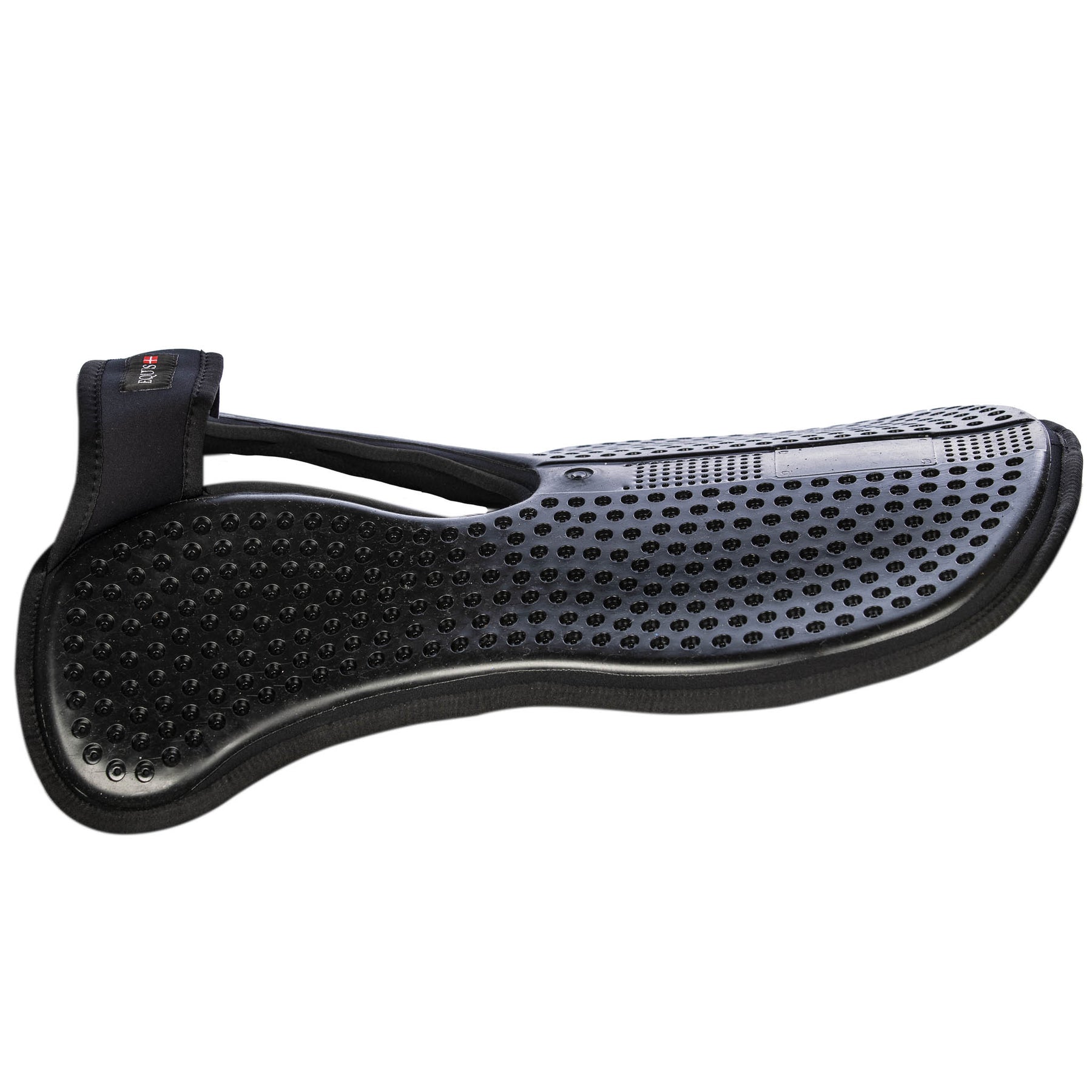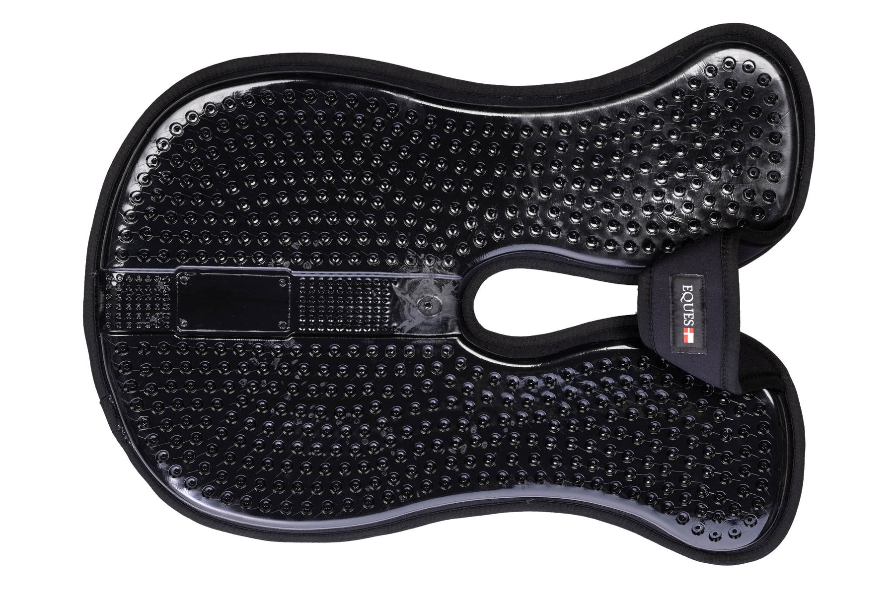 Oversiden af gelen sikrer sadlens position på underlaget. Materialet på undersiden består af blød fleece for at undgå at hestens hårsække generes under ridningen.