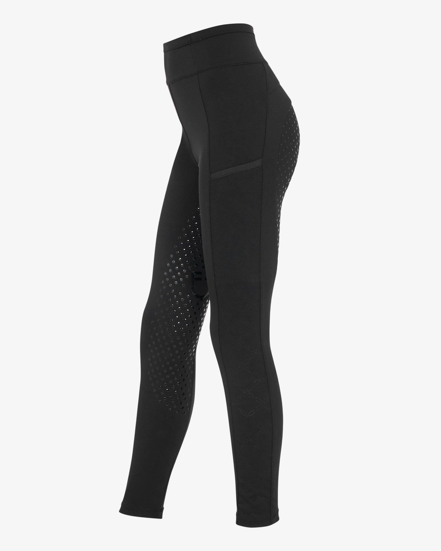 Det tekniske materiale hjælper med at regulere kropstemperaturen, så rytteren forbliver komfortabel under aktivitet. Den brede, elastiske linning giver ekstra støtte og sørger for, at leggingsene sidder stabilt hele dagen.