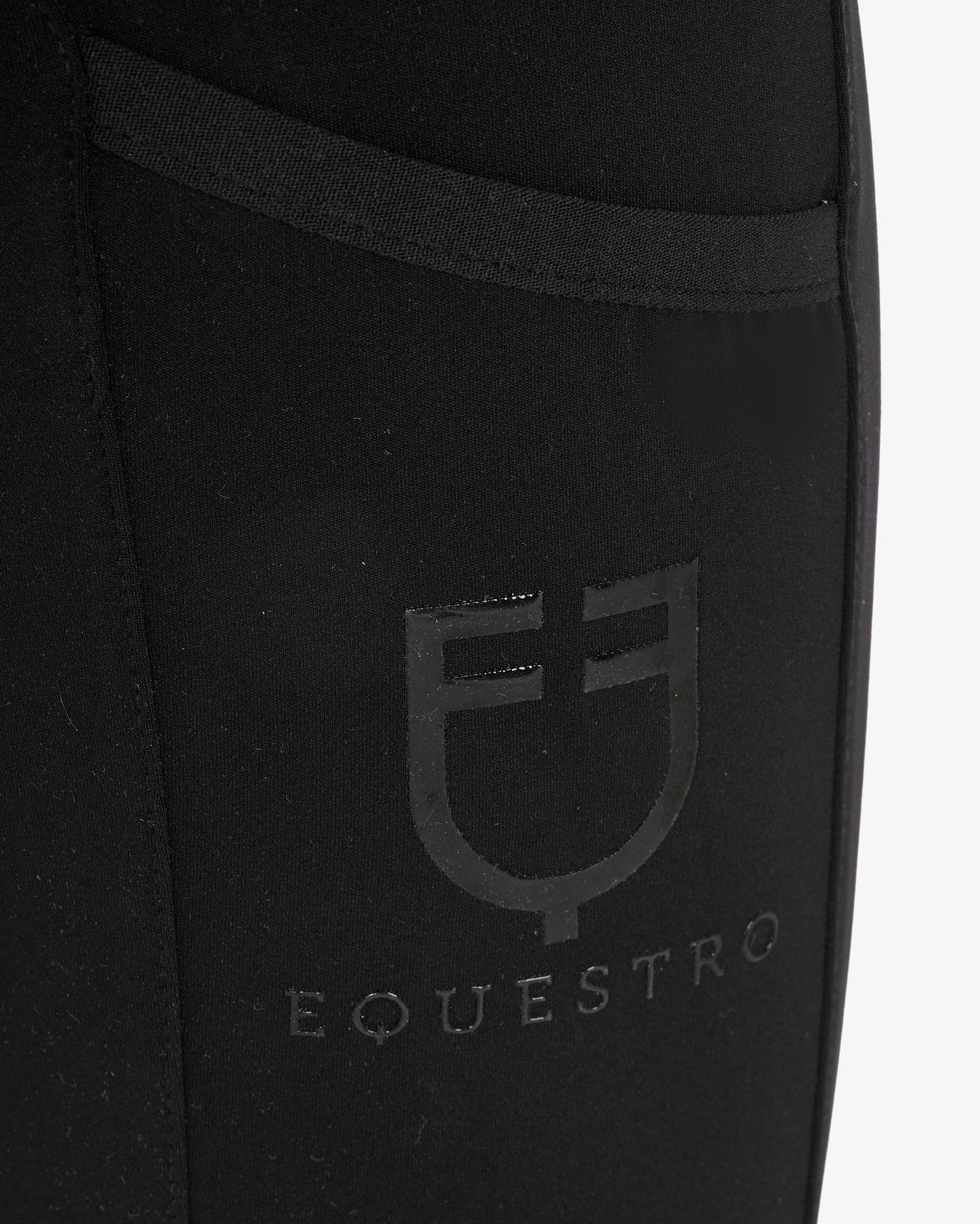 De praktiske sidelommer giver plads til små nødvendigheder, mens de perforerede indsatser langs benene med et diskret blomsterinspireret mønster tilfører både ventilation og et elegant touch. Full silicone grip med Equestro-logo sikrer stabilitet i sadlen og understøtter en korrekt og rolig opstilling.