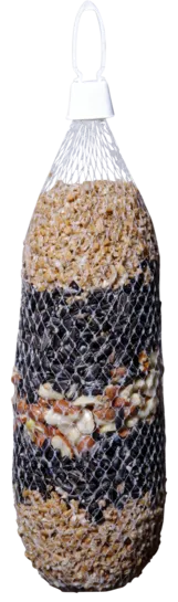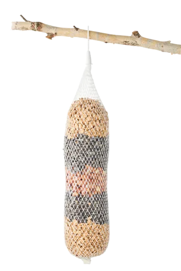 Fuglefoderstang med blading af forskellige nødder og fedt, med praktisk ophæng til grene