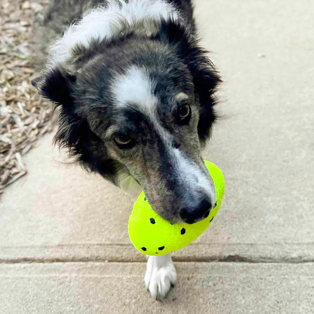 Det bidresistente, selvhelende materiale reparerer små tandmærker, så bolden kan holde til timevis af tyggeleg og apportering. Den flyder på vand og kan bruges året rundt, uanset vejr og terræn.