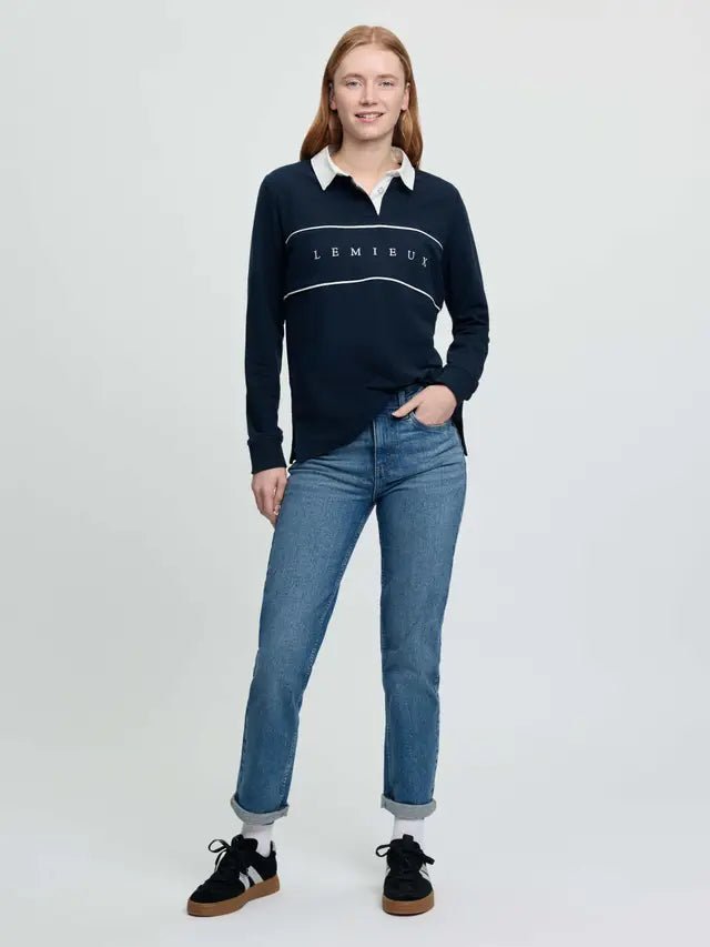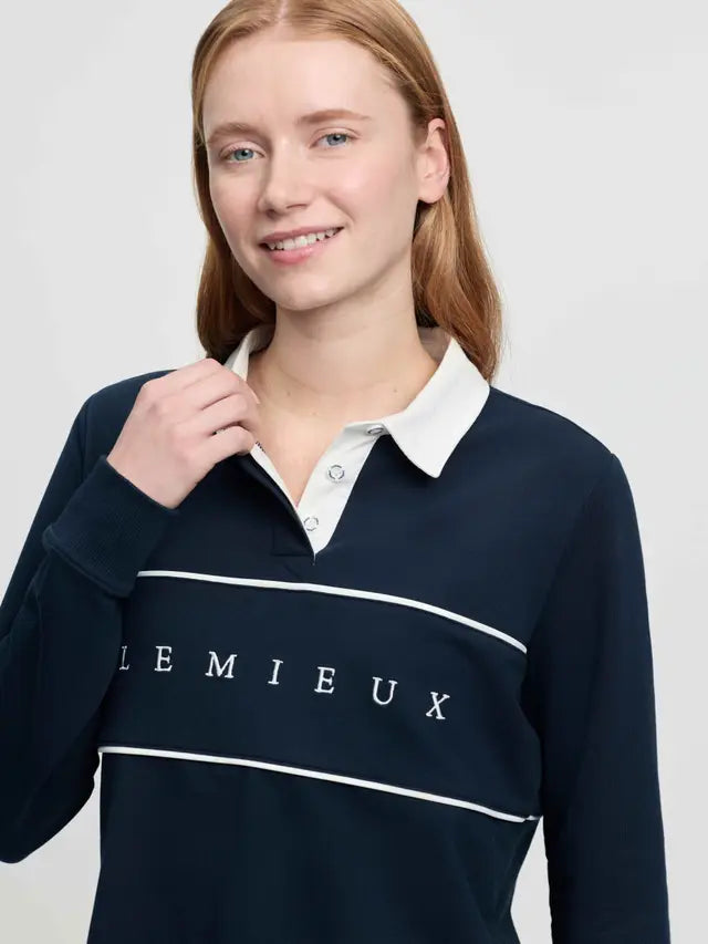 Den rummelige pasform skaber en moderne, boxy silhuet, der falder flot på kroppen og gør trøjen behagelig at have på hele dagen. Den klassiske bomuldskrave med hvide knapdetaljer og diskret LeMieux-logo giver et tidløst og sporty look.