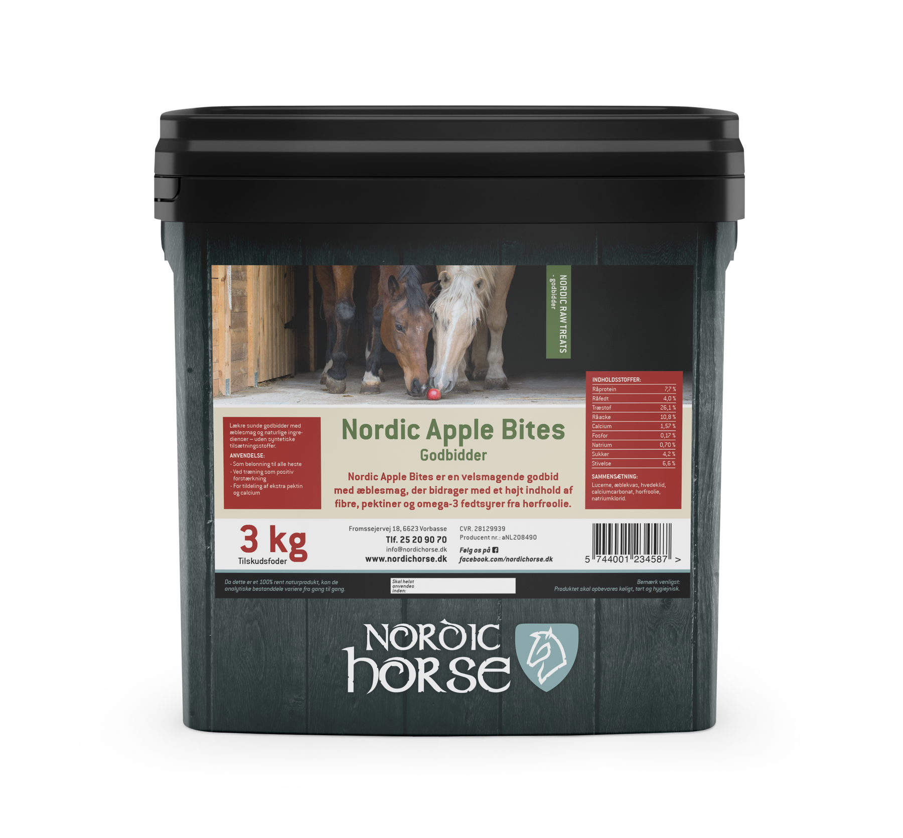 Nordic Apple Bites er en velsmagende godbid der bruges til belønning af hesten. De har smag af æble. Æble bidrager med fibre og pektiner. Derudover er der tilsat hørfrøolie for et godt omega-3 indhold