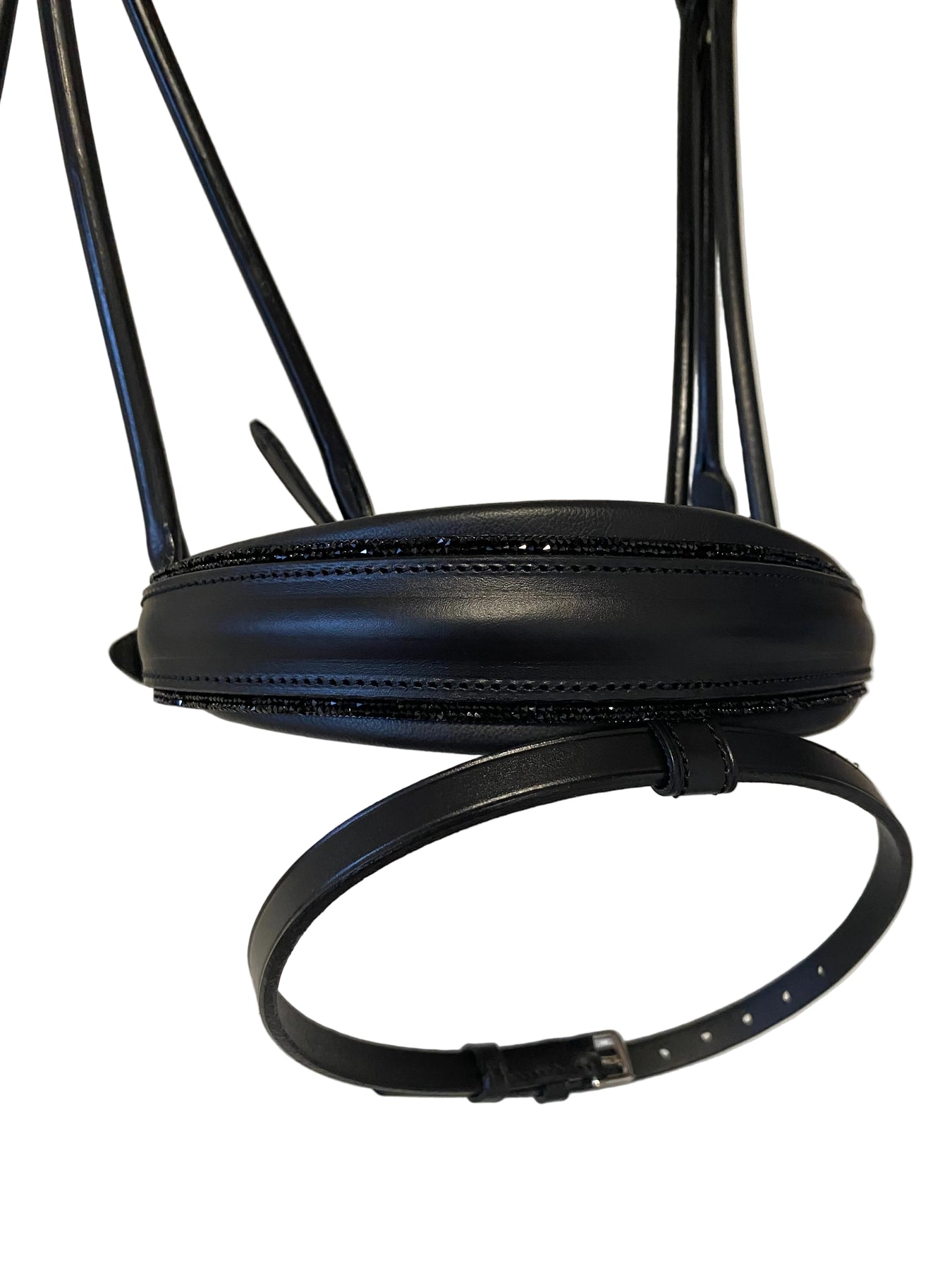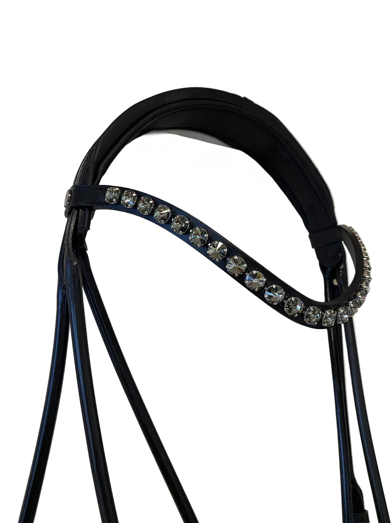 Den klassiske rundsyede trense kommer med et flot Rivoli pandebånd med svung og 10 mm. Black Diamond sten, et bredt næsebånd med sort foring samt et blødt anatomisk nakkestykke som sørger for at give hesten den bedste komfort og holder remmene i nakken på plads.