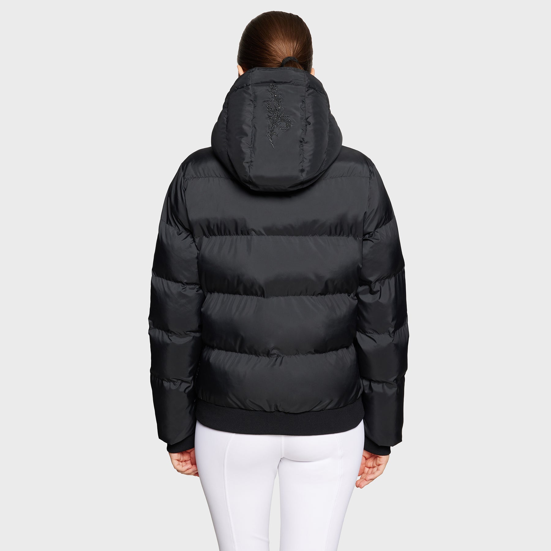 Jakken har et feminint og figursyet design med aftagelig hætte og gennemgående lynlås. Foran prydes den af Samshield-logoet i intarsia-krystaller, som tilfører et eksklusivt touch, mens de elastiske manchetter sikrer en behagelig og tæt pasform.