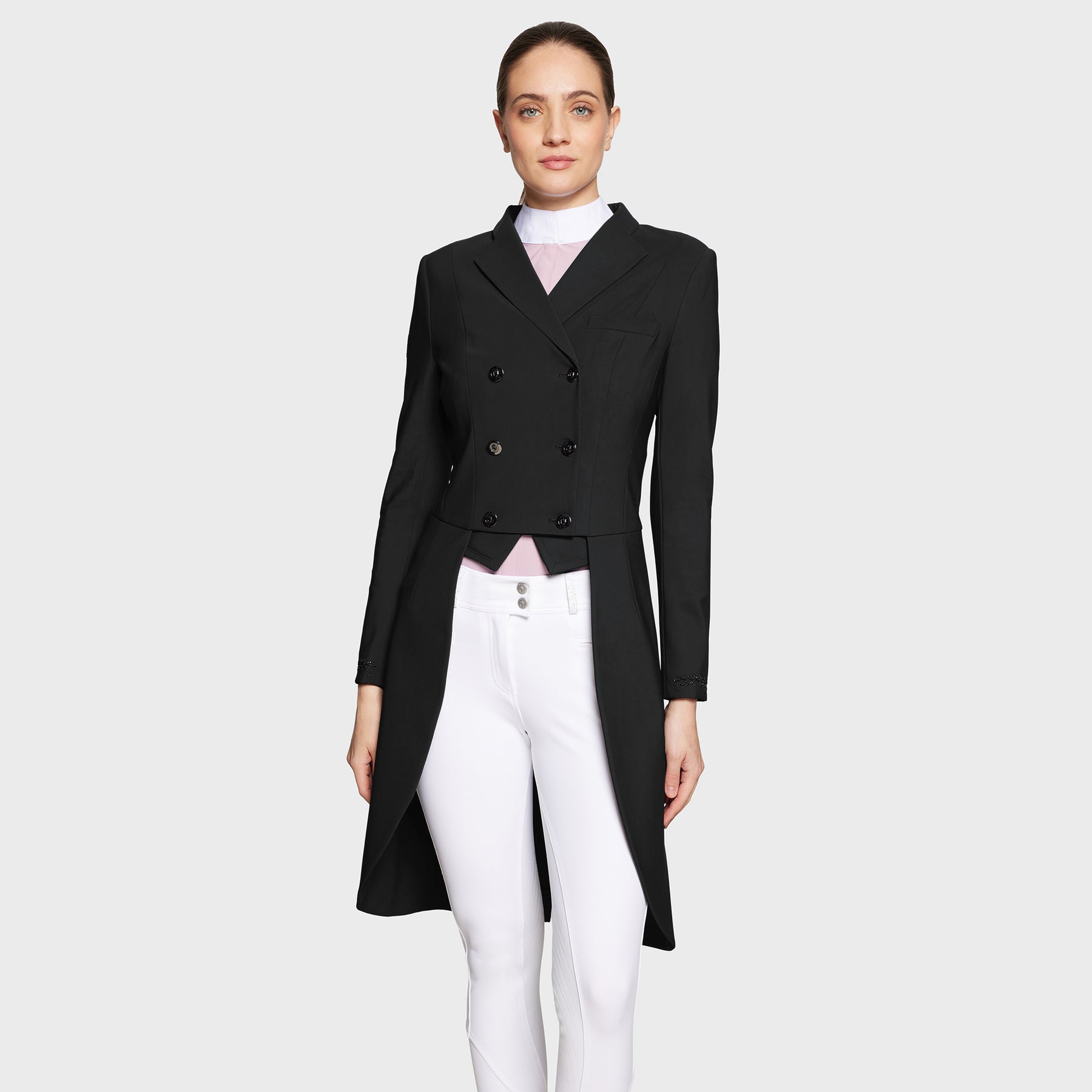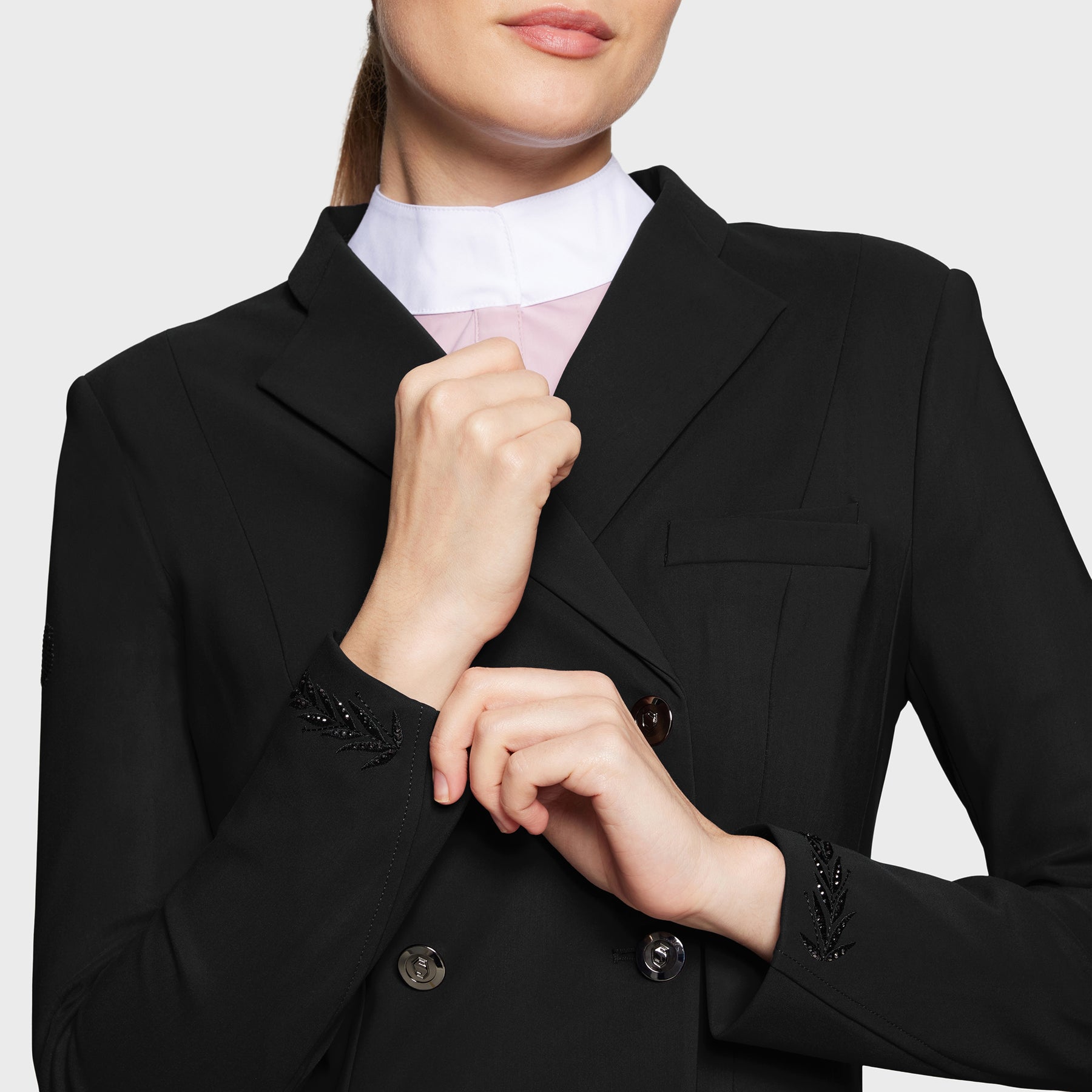 Designet udstråler elegance med blomsterbroderier i Swarovski®-krystaller på kraven og ærmekanterne, mens et diskret Swarovski®-logo på ærmet giver et luksuriøst finish. Den skjulte lynlås bag knapperne sikrer et rent og elegant udtryk, perfekt til konkurrencer på højt niveau.