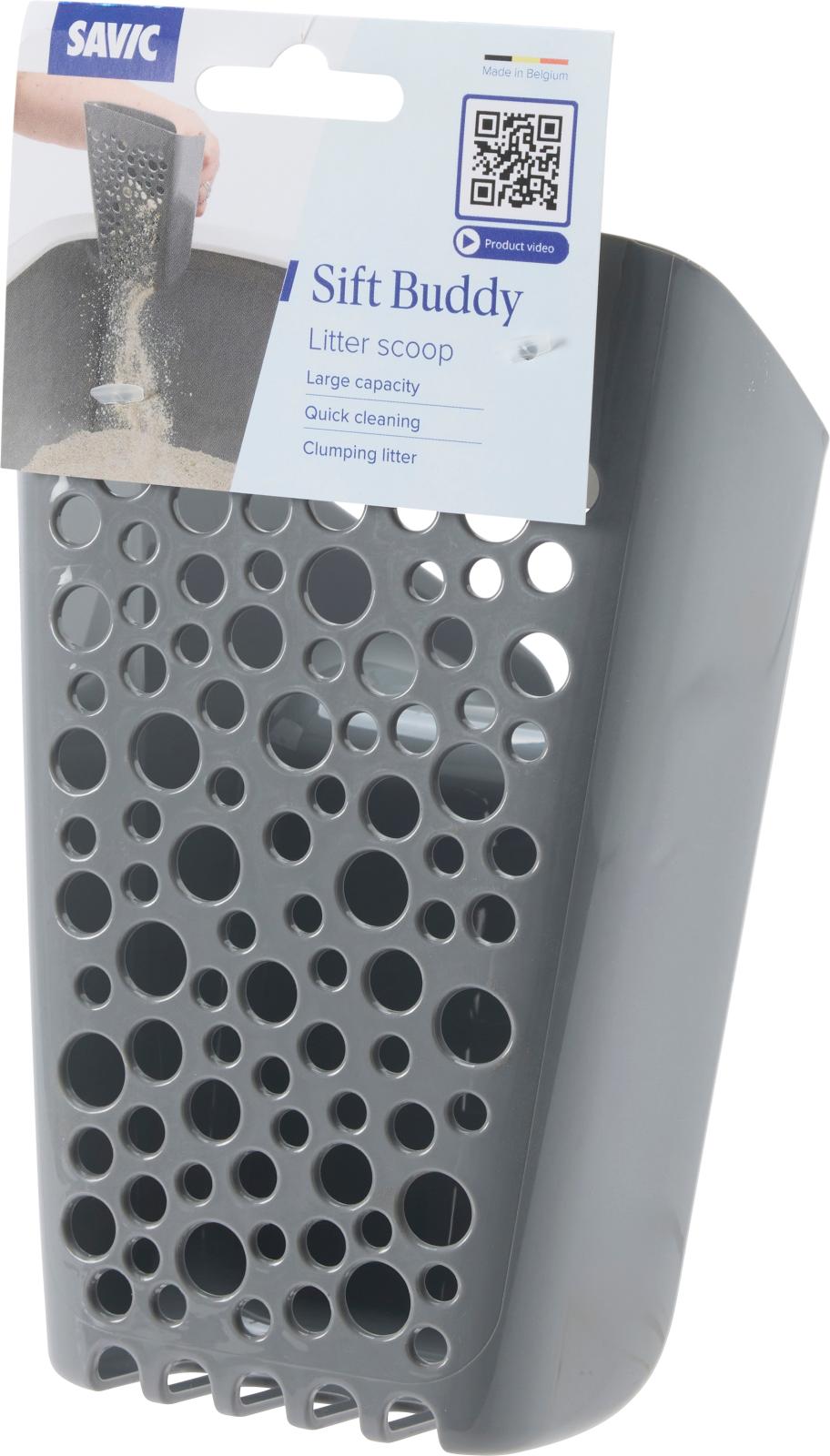 Det går hurtigere og sviner mindre med Sift Buddy Cool Grey – en stor skovl til kattegrus. Den er designet til klumpende kattegrus og har en bred skovlåbning og fine sigthuller, der hurtigt adskiller affaldet, mens det rene grus bliver i kassen.