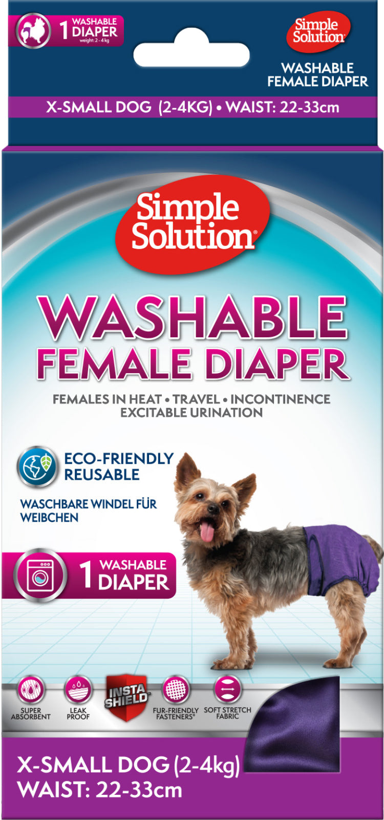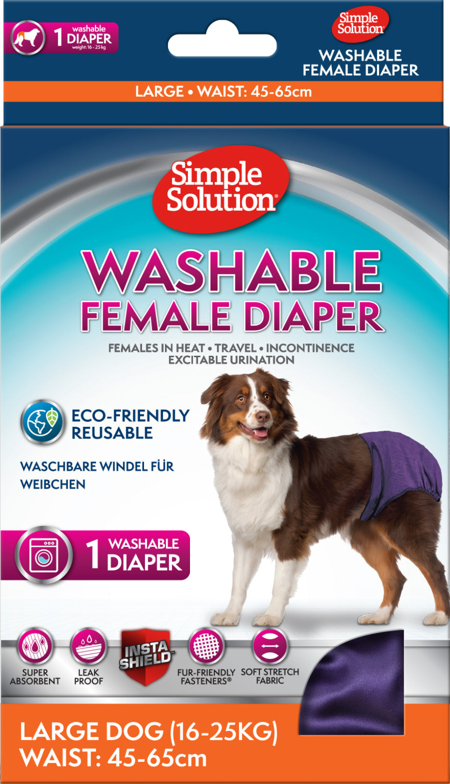 En diskret plastforing beskytter mod gennemtrængning, så du slipper for pletter og rengøring. Bleen kan bruges alene ved løbetid, let urininkontinens eller små dryp, men kan også kombineres med Simple Solution Diaper Liner for ekstra beskyttelse. Til hanhunde findes den tilsvarende Simple Solution Washable Male Wrap.