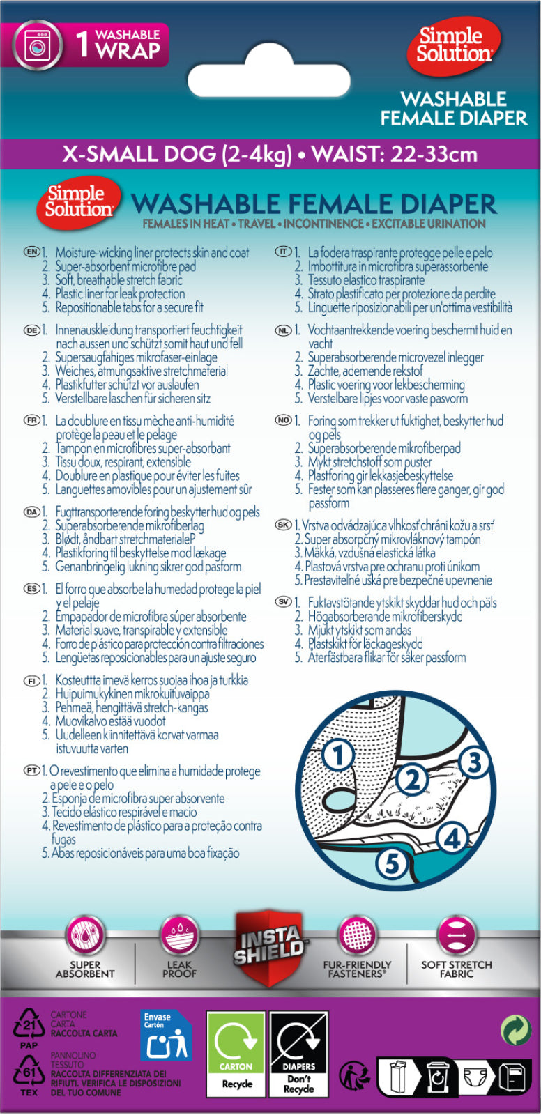 Få ro i hverdagen og styr på små uheld med Simple Solution vaskbare bleer til hunhunde. De er designet til at sidde behageligt, mens de beskytter både din hund og dit hjem mod lækager. Det bløde, strækbare materiale giver en god pasform, og den superabsorberende mikrofiberpude suger fugten effektivt. Samtidig sørger det svedtransporterende lag for, at din hund forbliver tør og komfortabel.