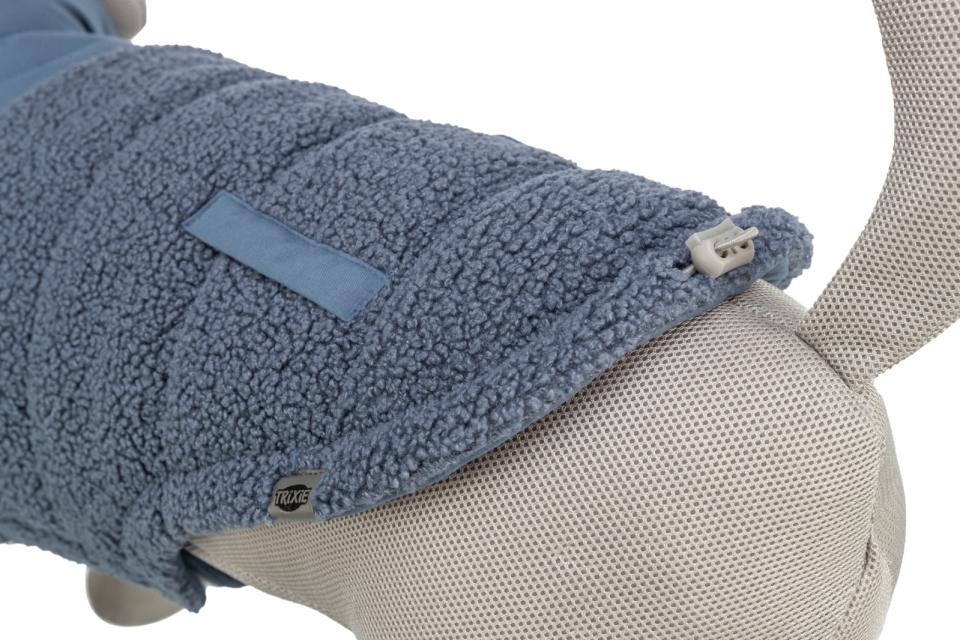 Jakken lukkes nemt med velcro ved bryst og mave, så den er hurtig at tage af og på. En ideel jakke til hunde, der skal holde sig varme og se godt ud på vinterens gåture.