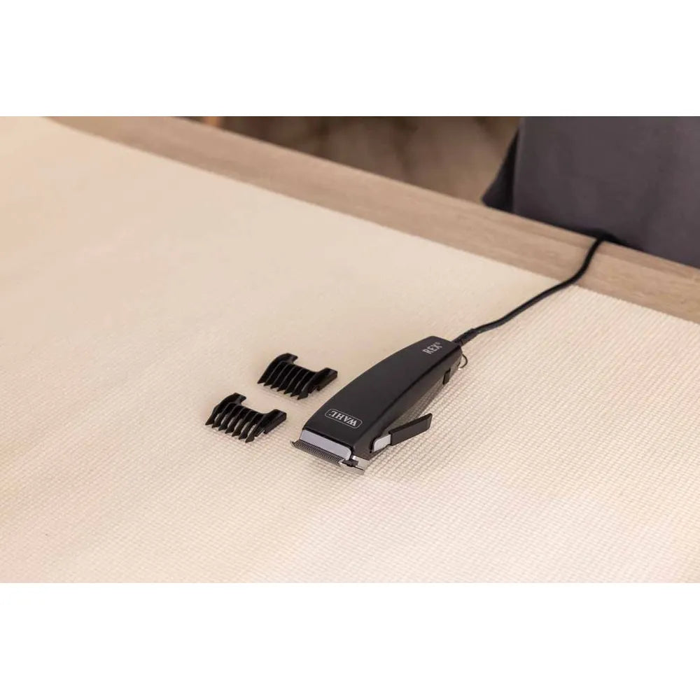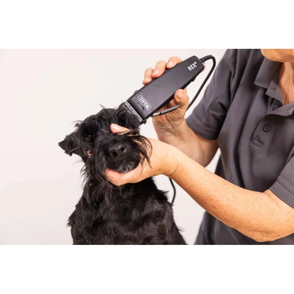 Pakken indeholder WAHL Rex klipperen med 1230 fineblade, to afstandskamme på 6 og 9 mm, beskyttelseshætte til bladet, rensebørste og olie – alt hvad du behøver for at komme i gang med professionel klipning derhjemme.